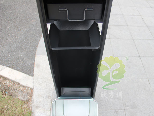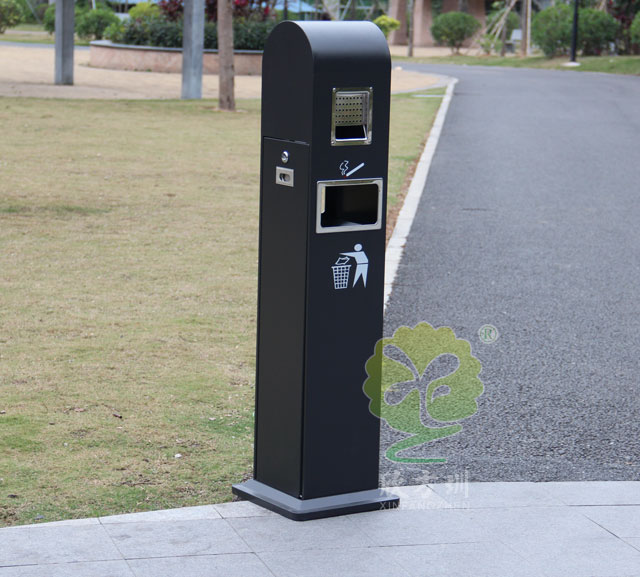 C629烤漆吸煙柱規格320*320*1200mm,呈方形,側面有三角鑰匙,可以打開側門,方便清理位于內套管的煙蒂煙灰,底座分兩種,一種是室內采用的,在底部裝有防滑墊,一種是戶外采用的,底部使用膨脹螺絲固定。外形兼具美觀性和功能性,實現煙蒂垃圾雙投放功能,上部分收集煙灰煙蒂,下部分收集果皮垃圾。隔緣分離,杜絕火災。